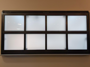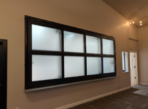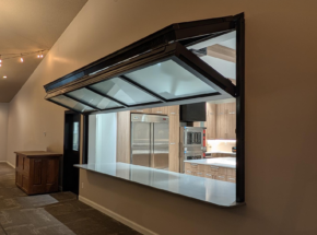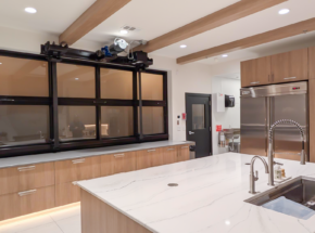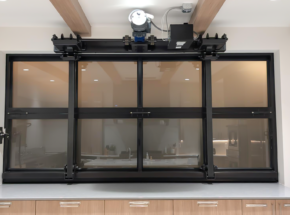 This glass bi-fold door seamlessly separates the kitchen from the church sanctuary. Its sleek design allows the spaces to be connected when open while providing privacy when needed.