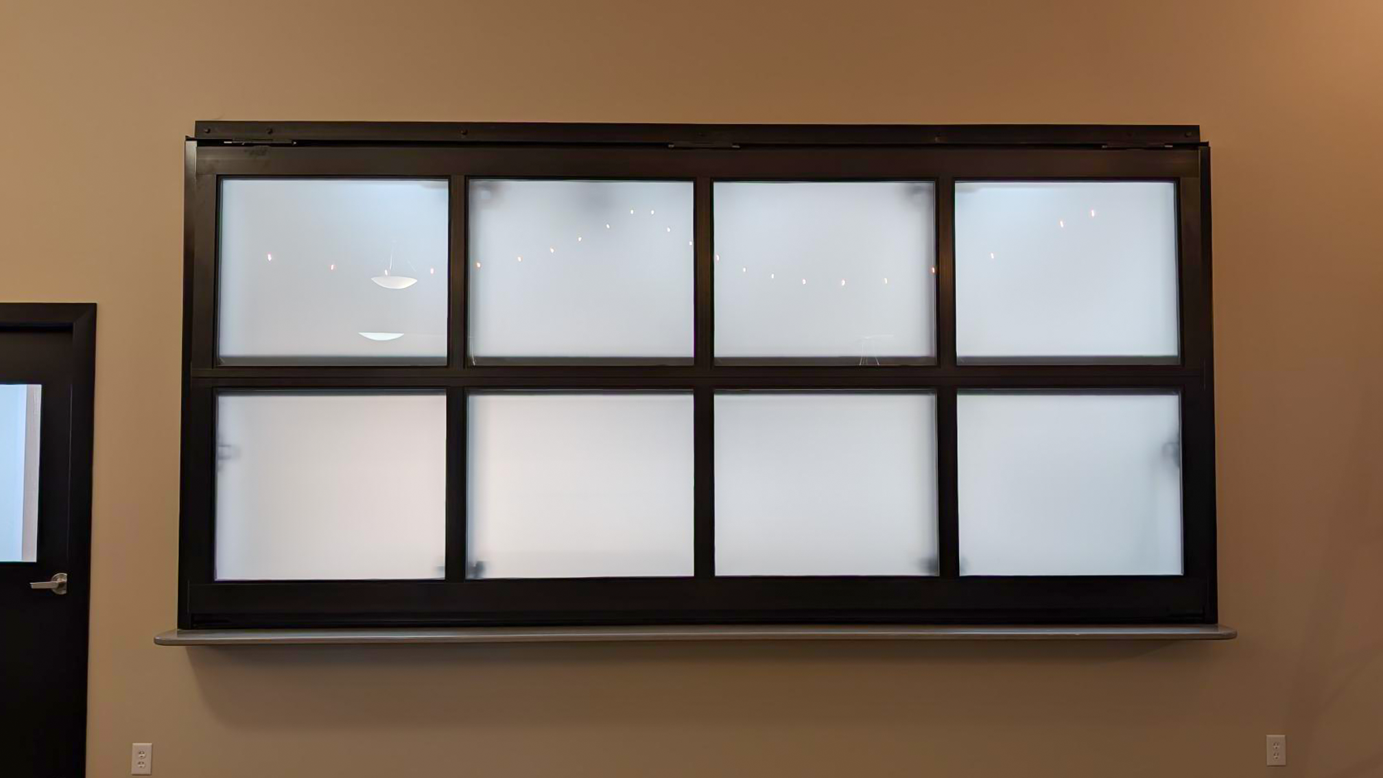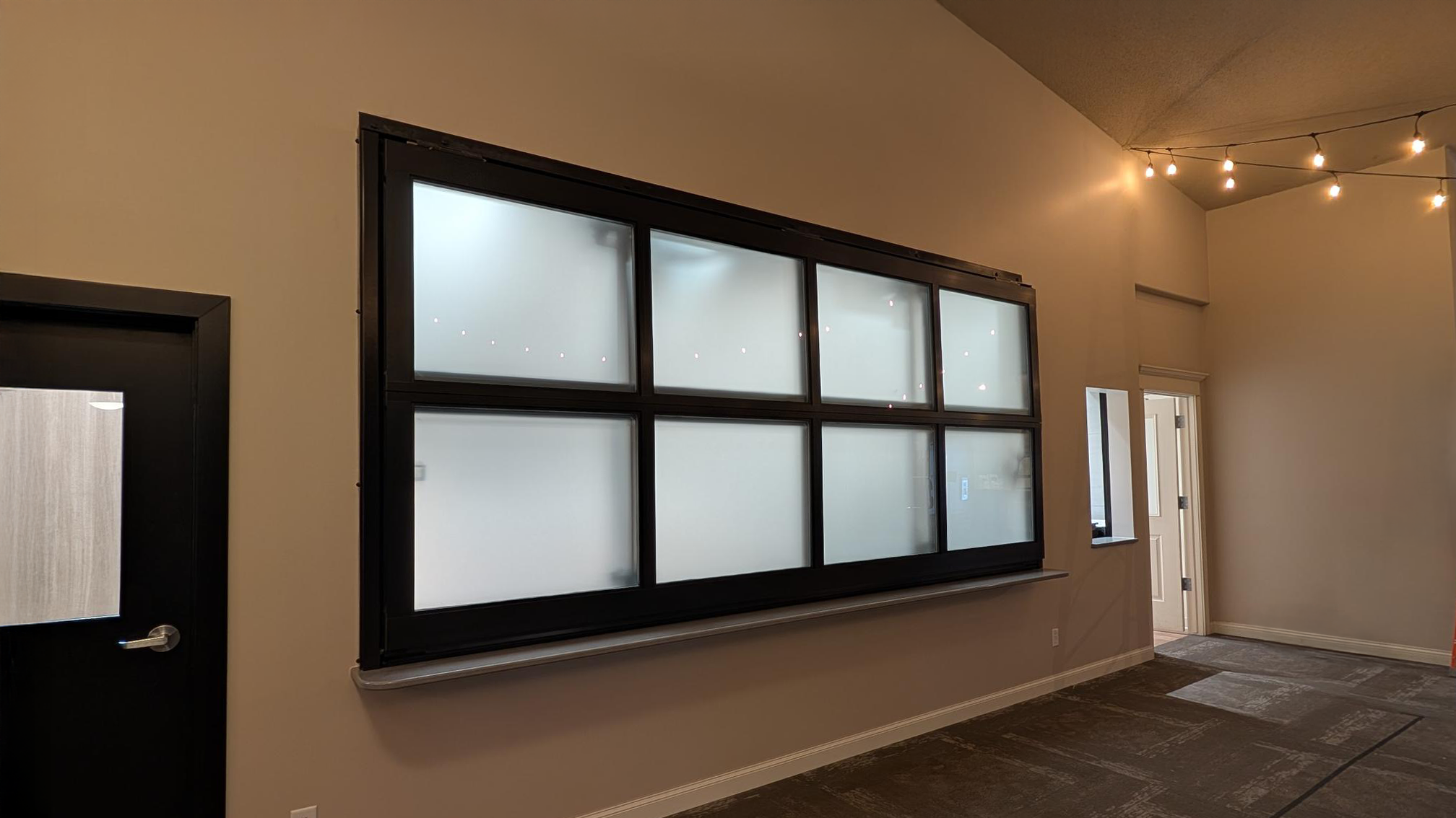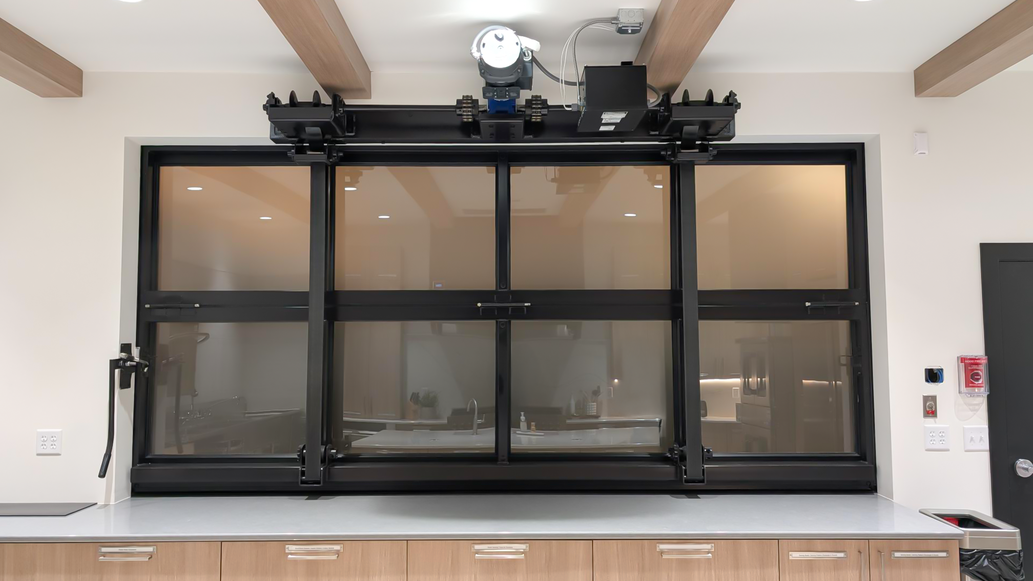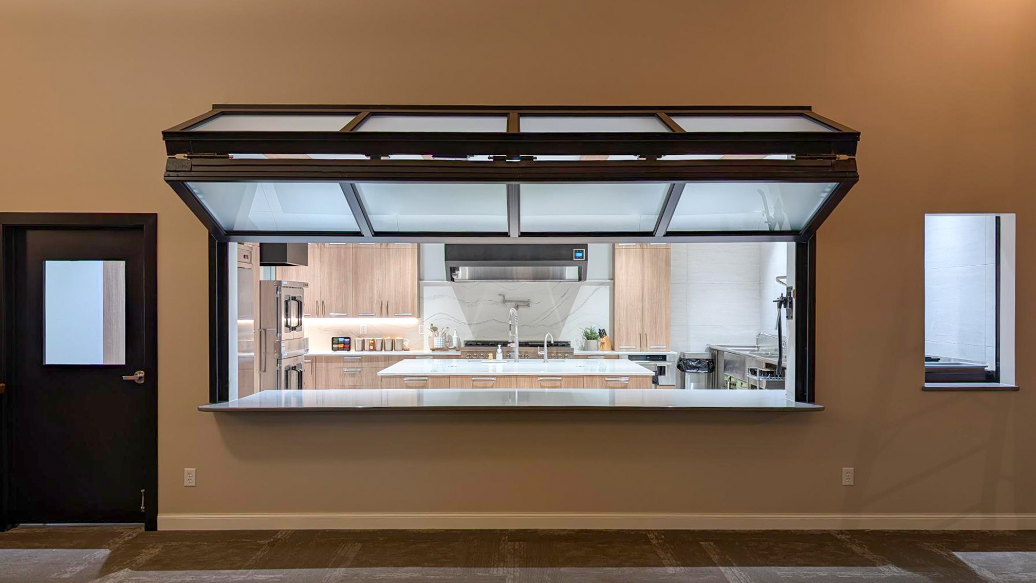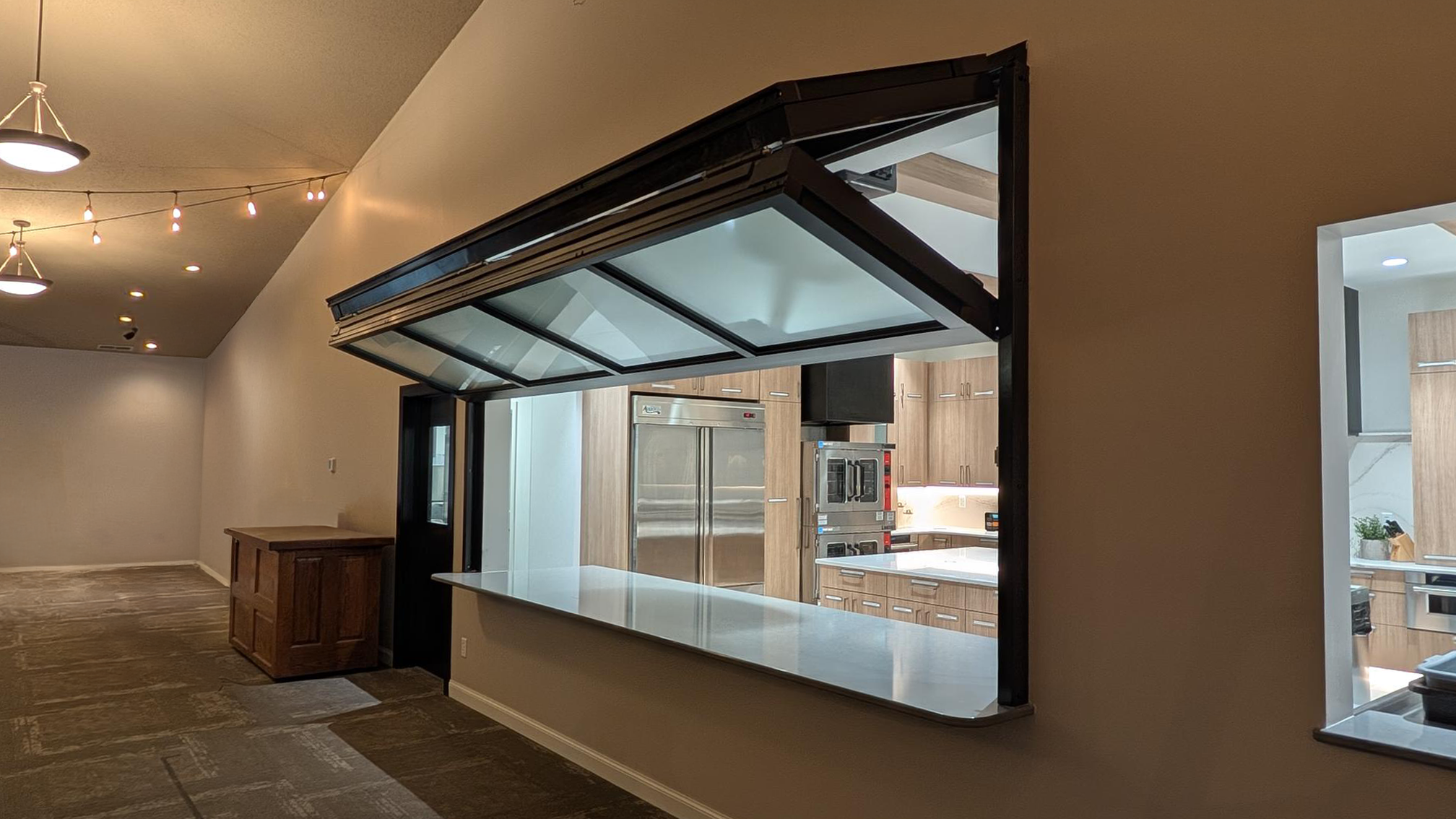 This glass bi-fold door seamlessly separates the kitchen from the church sanctuary. Its sleek design allows the spaces to be connected when open while providing privacy when needed.